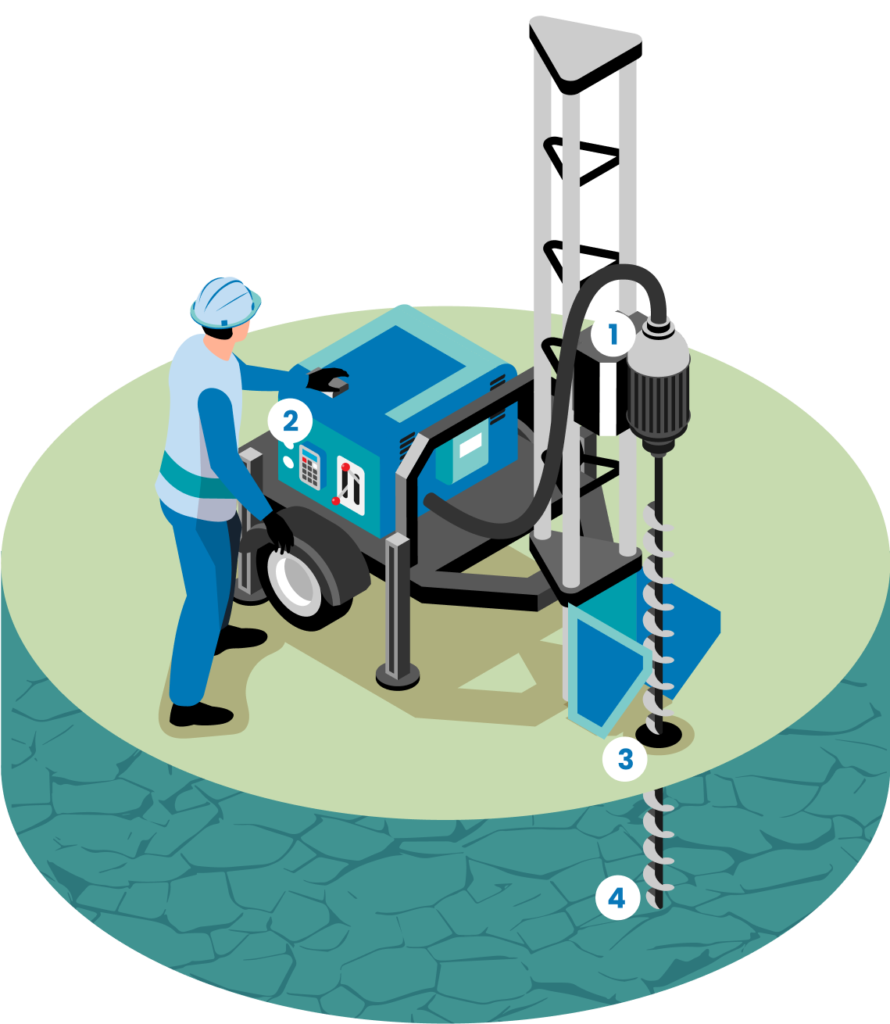 - A hydraulic pump powers the drill’s rotary mechanism.